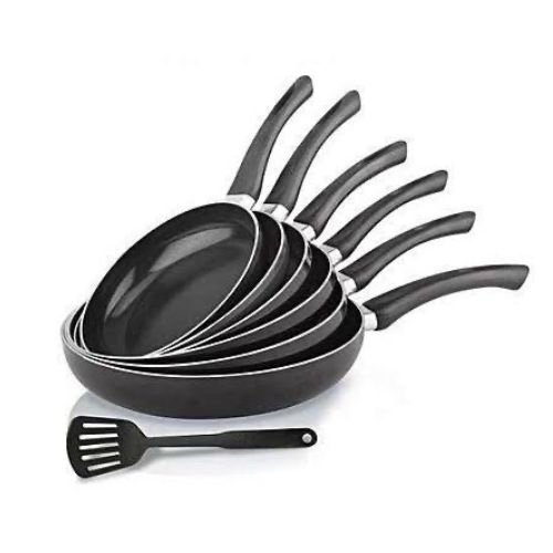 This comprehensive cookware collection includes 6 non-stick fry pans in various sizes, accompanied by a convenient spoon for effortless food handling.