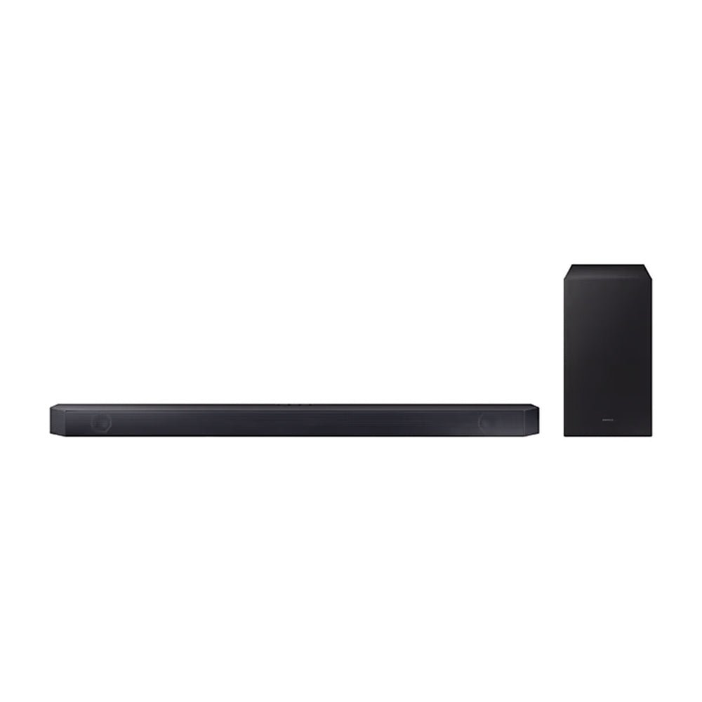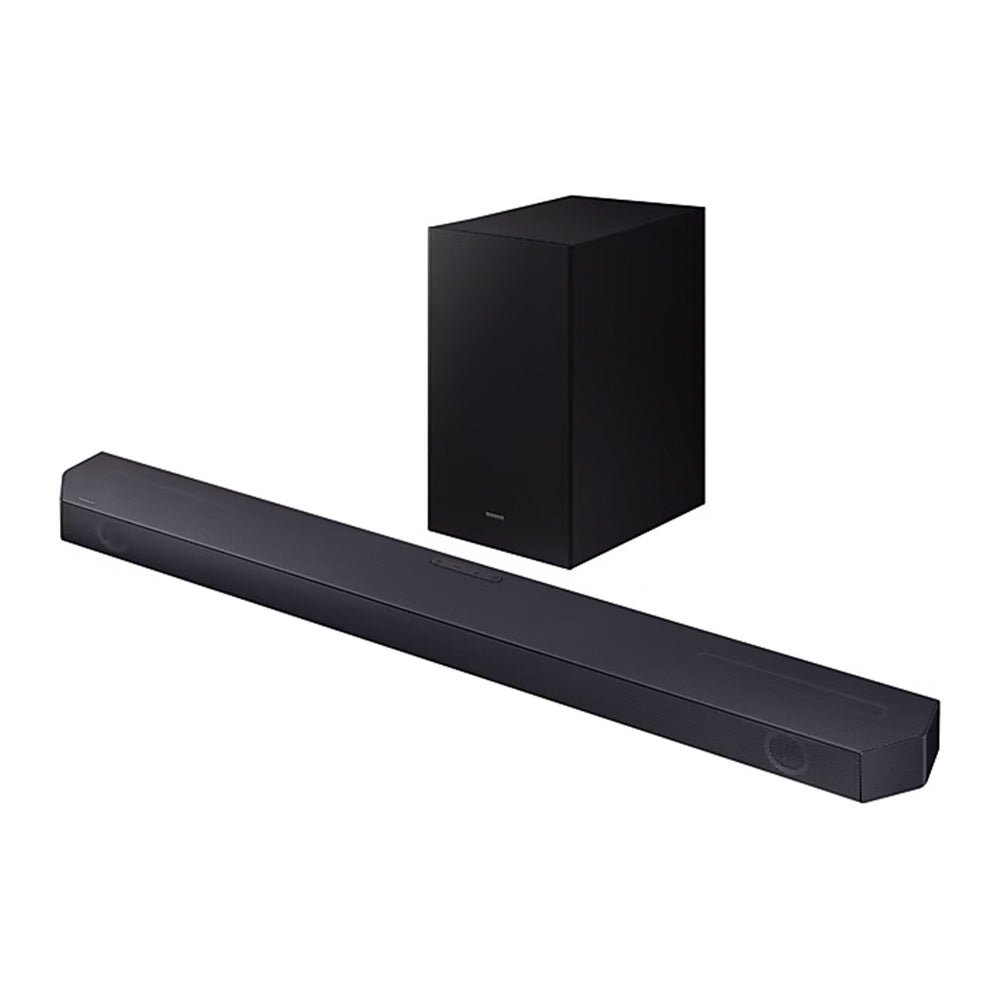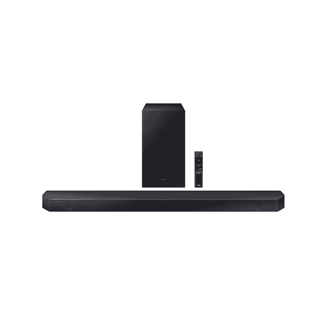 Enhance your setup with Q-Symphony, which synchronizes the soundbar with compatible Samsung TVs for perfectly balanced, room-filling audio. The Adaptive Sound feature intelligently optimizes sound for each scene, ensuring crystal-clear dialogue and detailed effects, while Game Mode Pro boosts gaming audio with deep bass and directional sound from powerful woofers and up-firing speakers.